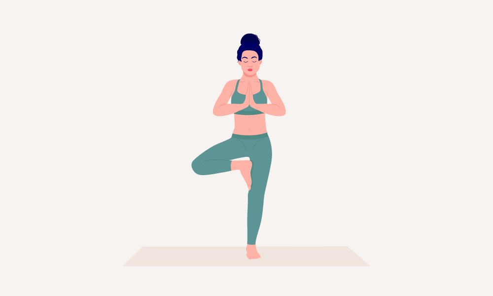 - Partiendo de la postura anterior puedes llegar a la postura del árbol, una postura clásica, fácil de realizar. Se trata de apoyar una planta del pie en el suelo y otra en el muslo dibujando una especie de triángulo entre las piernas. Puedes dejar las manos como las tenías en la anterior postura.